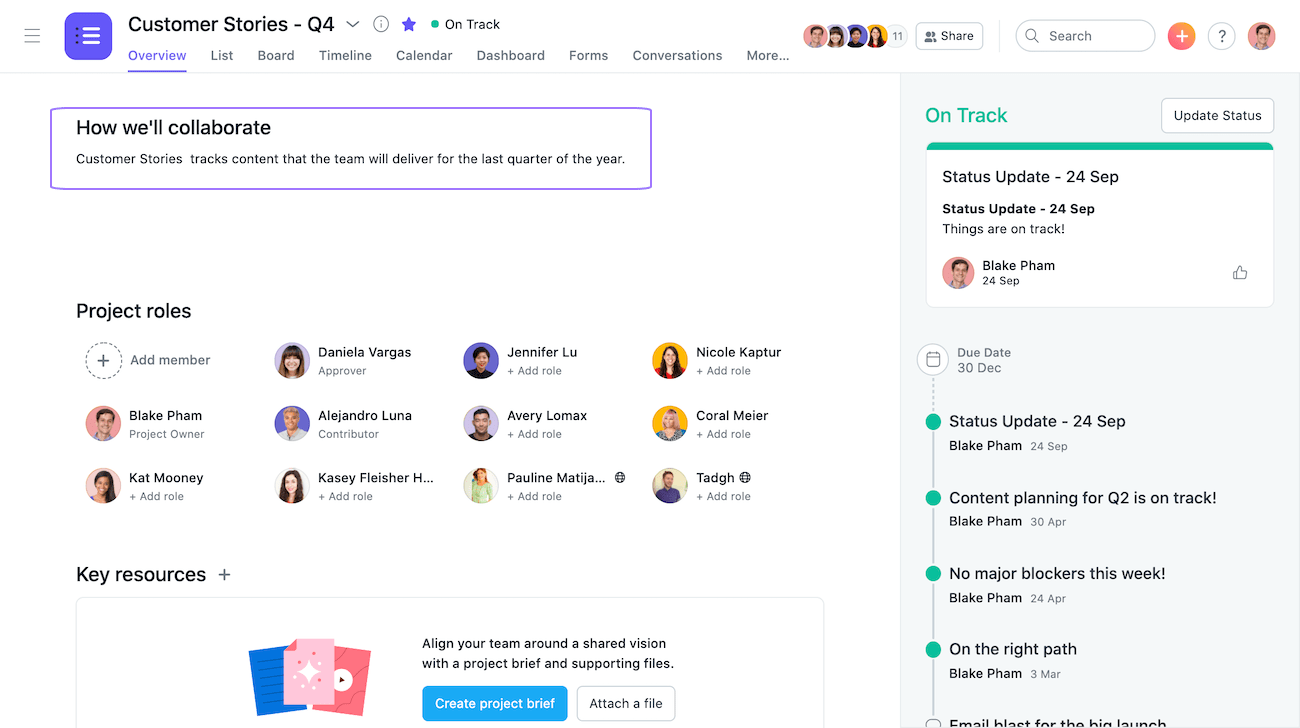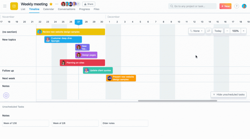 Use Asana’s timeline feature to create a plan that shows you exactly how the pieces of your project fit together as a whole.